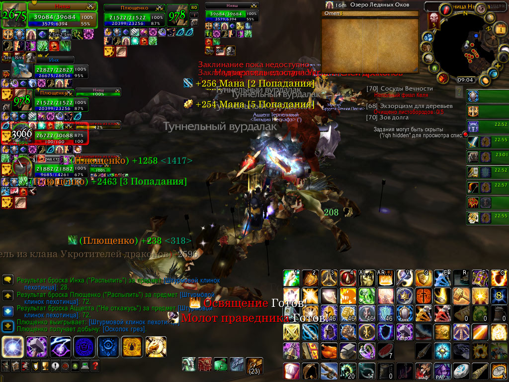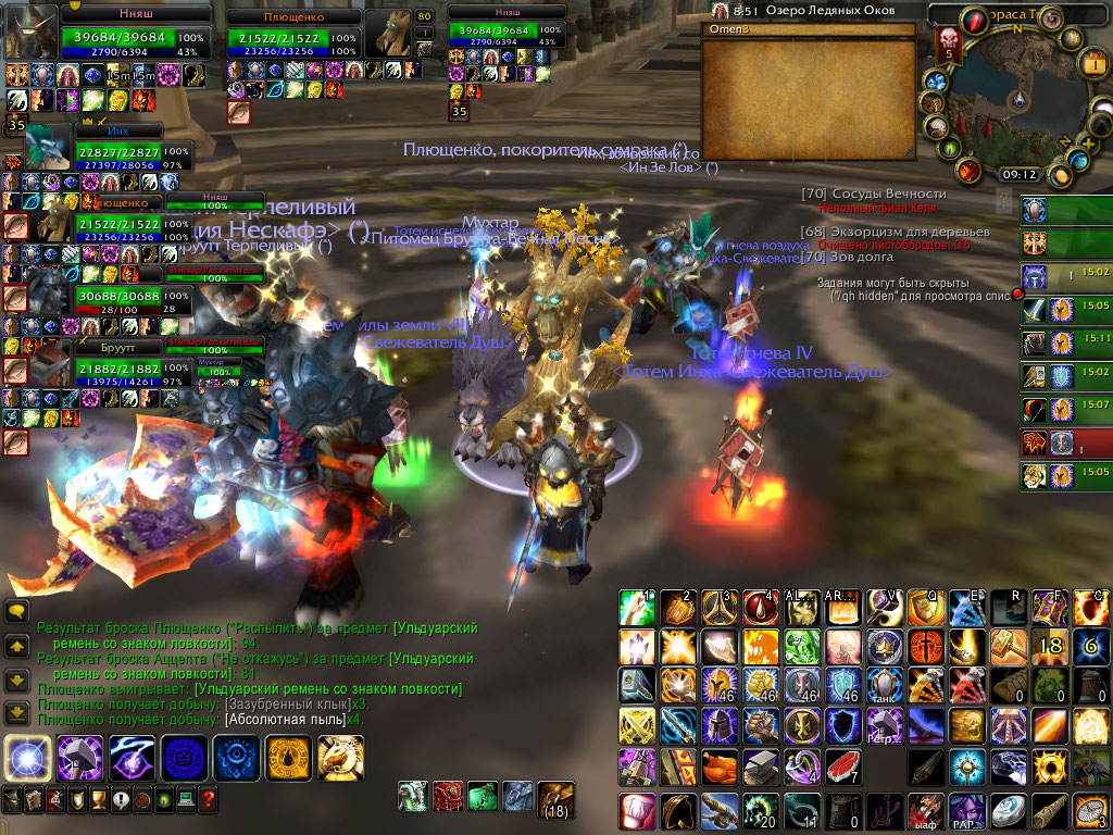 | ужасный интерфейс, до кучи тут не хватает рекаунта между оменом и экшнбарами, как так играть если 2/3 экрана закрыты, а посередине всплывают огромные, ничего тебе не говрящие надписи, жесть РЕбят, все у кого похожий интерфейс, задумайтесь, ведь это же мешает получать удовльствие от игры, нихрена не видно что творится вокруг, тем самым вы подвергайте вайпу ваши рейды/группы, зачем отображать баффы членов группы? вот зачем, для чего они? зачем смотреть на огромные рекаунты, омены, палипауверы и тд? зачем всплывающие надписи посреди экрана, если в динамике вы их не читаете? стандарный интерфес гораздо удобнее, имхо для примера покажу свой, хотя и здесь есть над чем поработать. [img] [/img]